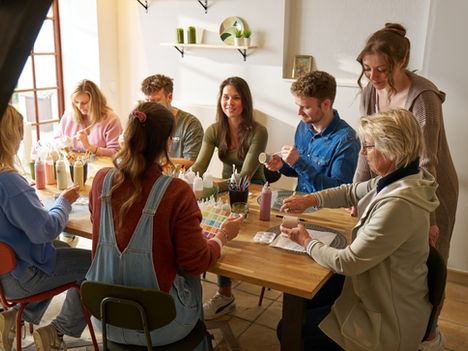 Der Malraum bietet Platz für bis zu 22 Personen, verteilt an drei Tischen und der Theke.